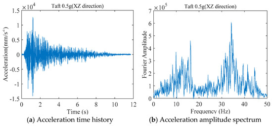 Taking the Taft wave with a peak acceleration of 0.5 g in the X, Z directions as an example, the measured acceleration time history and amplitude spectrum are shown in Figure 7.