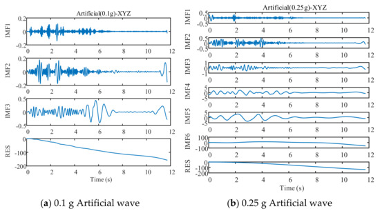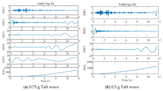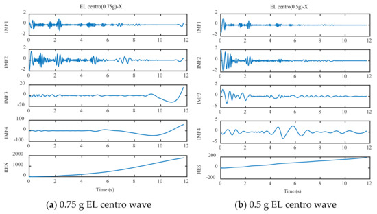 Taking the EL centro wave of 0.5-g peak acceleration in X direction loaded by the shaking table on the LNG storage tank model as an example, the displacement obtained from EMD (the blue line in Figure 2g) was compared with the actual displacement data (the red line in Figure 2g) recorded by the pull-wire displacement sensor of the shaking table, and it could be seen that this method has a specific baseline correction effect (Figure 2).