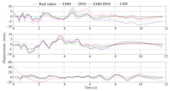 It can be seen from Figure 11 that the displacement time-history curves fitted by different methods have a certain baseline correction effect. However, it can be found from Figure 11 that the displacement curve fitted by the least squares method and the EMD has a larger dispersion and has a larger offset value compared with the real displacement. Figure 11 shows that the DNN detrend method will weaken the characteristics of the curve, resulting in a smaller value at the peak compared with the real value. In the three figures, the displacement curves obtained by EMD–DNN are the closest to the real displacement in the time history and have the highest degree of fitting.