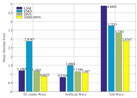 As can be seen from Figure 12, the mean absolute errors value of the least squares method in Artificial wave and EL centro wave are small, but the MAE value in Taft wave is larger than that of the EMD–DNN, which is 2.0145 larger than that of EMD–DNN. This verifies the idea of Yuanzheng Lin [15] that the least squares method can only solve the baseline drift caused because the assumed initial value of velocity or displacement is not consistent with the actual situation. The MAE value of the traditional EMD is higher in the three waves, and the MAE value of the DNN is lower than that of the EMD. In general, the mean absolute error of the EMD–DNN is the smallest compared with other correction methods, indicating that the EMD–DNN is improved to different degrees on the basis of the traditional EMD and the DNN only. In EL centro wave, EMD–DNN was 0.3016 smaller than DNN; in the Artificial wave, EMD–DNN is 0.0676 smaller than DNN. In the Taft wave, EMD–DNN is 0.4614 smaller than DNN. Compared with other correction methods, the MAE of EMD–DNN in EL centro wave is the smallest, and the value is 0.8625.