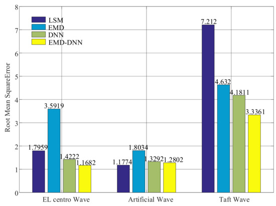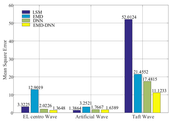 As shown in Figure 14, the root mean squared errors of the least squares method in both artificial wave and EL centro wave are small, but the value of the least squares method in Taft wave is larger. In general, the root mean square error of EMD–DNN is the smallest compared with other correction methods. In EL centro wave, EMD–DNN is 0.254 less than DNN. In artificial wave, EMD–DNN is 0.049 smaller than DNN. In the Taft wave, EMD–DNN is 3.8759 smaller than DNN. Compared with other correction methods, MSE of EMD–DNN in the EL centro wave is the smallest, and the value is 1.1682.