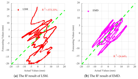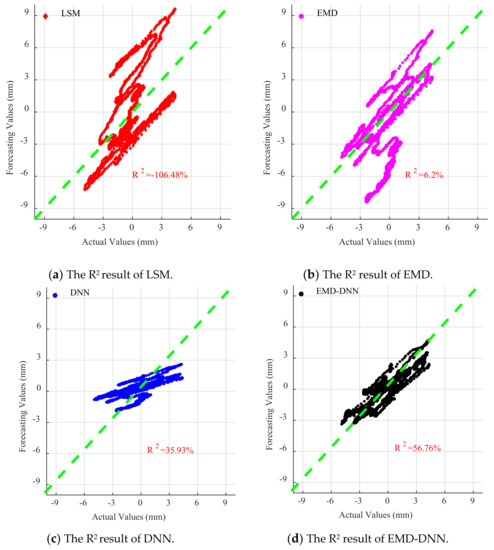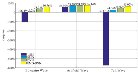 As can be seen in Figure 15, for all waves, the fitting degree of least square method is poor, indicating that the correction effect of least square method in the time history of drift displacement is poor, and the fitting degree of EMD is better than that of least square method in the time history of displacement. However, compared with the traditional EMD and least square method, DNN and EMD–DNN greatly improve accuracy, and EMD–DNN has the highest fitting degree. In EL centro wave, EMD–DNN is 20.83% higher than DNN. In Artificial wave, EMD–DNN is 1.86% higher than DNN. In the Taft wave, EMD–DNN is 20% higher than DNN. The highest fitting degree of EMD–DNN in artificial wave is 76.14%.