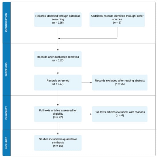 A total of 134 search results were identified through database searching and additional sources. After removing all duplicates, 117 studies underwent title and abstract screening, and the inclusion criteria were examined. The full texts of 22 papers assessed for eligibility were carefully analyzed. Three articles [16,17,18] were excluded due to the exclusion criteria (1), one contribution [19] due to the exclusion criteria (2), and two scientific results [20,21] due to the exclusion criteria (3). Finally, only 16 studies were included in the quantitative synthesis. The methodological approach is presented in Figure 1. For facilitating analysis and comparisons, we summarized all relevant BCI existing solutions and related system parameters in Table 1. In Section 4, we discussed each study, contextualizing the results in the BCI realm.