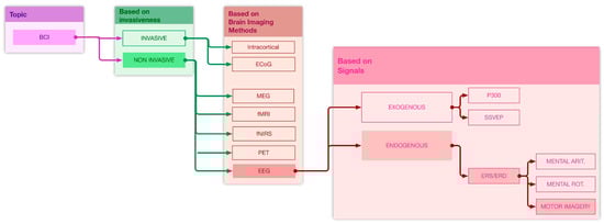 In light of these observations, EEG-based BCIs, particularly those using motor image paradigms applied to wheelchair apparatus control, represent the sub-area of interest of our review (Figure 2). Although they are outside the scope of this work, for completeness of discussion, other relevant uses of motor imagery BCI must be cited and analyzed. Indeed, in addition to managing wheelchair movement and control, a MI BCI has a wide range of applications, such as virtual reality, neurorehabilitation, and controlling robotic devices [52]. The scientific research on BCI technology has also been focused on other medical applications [52,53,54,55], with many BCIs intended for the replacement or restoration of central nervous system (CNS) functionality lost due to illnesses (such as amyotrophic lateral sclerosis and locked-in syndrome) or to trauma (such as spinal cord injury), and others focused on therapy and motor rehabilitation [38].