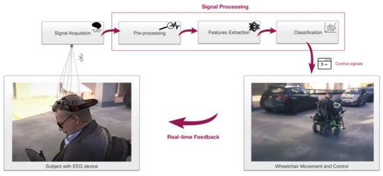 The general architecture of a brain-controlled wheelchair system and application example in a real environment. Reproduced with permission [86,87]. Graphics by [88].