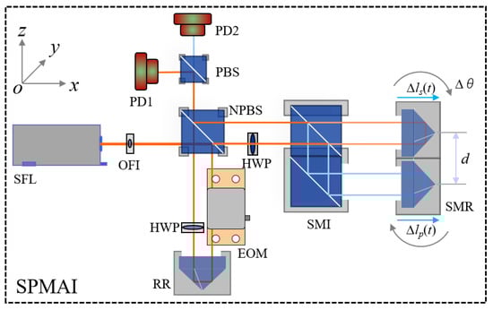 The optical configuration of the proposed SPMAI is shown as Figure 1. The SPMAI is based on a symmetrical Michelson-type interferometer. The single-frequency He–Ne laser (SFL) is used to emit a linearly polarized beam, which is separated into two parts after a non-polarizing beam splitter (NPBS), a reference beam (RB) and a measurement beam (MB). An optical Faraday isolator (OFI) is placed between the SFL and the NPBS. It should be noted that the use of the OFI not only can prevent any stray light from reflecting onto the laser, but can also rotate the polarization direction of the laser beam to direct it along the y axis. The RB is reflected by the NPBS and transmitted through an electro-optical phase modulator (EOM), a reference retro-reflector (RR) and a half-wave plate (HWP) in sequence. The EOM can modulate the phase of the laser beam under the added drive voltage Vi and the modulated phase φeom can expressed as φeom = (Vi/Vπ)π, where Vπ denotes half-wavelength voltage of the EOM. The MB is transmitted through the NPBS and further separated into two parts by a sinusoidal measurement interferometer (SMI) based on its polarization states, s-polarized MB (s-MB) and p-polarized MB (p-MB). Here, the SMI is constructed by two polarizing beam splitters (PBSs). Both s-MB and p-MB are incident on the two measurement retro-reflectors (MRs) of the SMR and their reflected beams are recombined at the NPBS. Furthermore, using a PBS, the s-polarized beam of RB and s-MB are reflected and their produced interference signals Is are detected by the photo-detector 1 (PD1). Similarly, the p-polarized beam of RB and p-MB are transmitted through the PBS and their interference signals Ip are detected by the PD2. It should be noted that the SMR is constructed by two identical retro-reflectors. Compared with other counterparts (i.e., reflective mirror and right-angle prism), the retro-reflector can reflect the incident beam by 180° within a wider incident angle range. These two retro-reflectors are fixed by a designed mechanical structure and their separation distance is assumed as d. In our previous paper [12], the effect of the thickness difference and parallel error on measurement angle error has been analyzed. As the SMR is rotated, the optical path of the s-MB and p-MB is changed and, thus, Is and Ip have a corresponding change. As the EOM is modulated by a sinusoidal voltage signal, Is and Ip can be written as