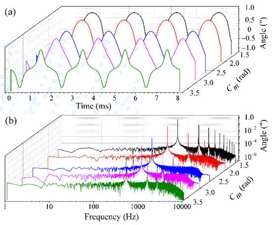 It can be noted, from Equations (9) and (10), that the demodulation results cannot be influenced by the laser intensity disturbance; however, the existence of the modulation depth deviation and carrier phase delay would result in a demodulation error. Firstly, the relationship between the demodulation results and cm was investigated, as other factors were omitted. Here, the carrier modulating frequency and sampling rate were respectively assumed to be 10 kHz and 100 kHz. The amplitude and vibration frequency of the simulated signals were assumed to be 1″ and 500 Hz, respectively. In addition, the white Gaussian noise with an SNR of 50 dB was added to the simulated signals. As cm was increased from 1.63 rad to 3.63 rad with an arbitrary increment, the simulated results are shown in Figure 3. Figure 3a presents the demodulation results in the time domain. From Figure 3a, one can see that the waveform distortion becomes more obvious as cm deviates from 2.63 rad. Using the fast Fourier transform (FFT), the demodulation results in the frequency domain are obtained and shown in Figure 3b. From Figure 3b, one can see that there exist several high-frequency harmonic components when cm does not equal to 2.63 rad. Furthermore, the total harmonic distortion (THD) and the signal-to-noise and distortion ratio (SINAD) are used to evaluate the demodulation results obtained with the PGC-Arctan demodulation algorithm. It should be noted that THD refers to the ratio between the equivalent root-mean-square (RMS) amplitude of all harmonic frequencies and the amplitude of the fundamental frequency, while SINAD refers to the ratio of the power of the fundamental frequency to the sum of the powers of all noise and harmonic frequencies. Here, the amplitude, THD and SINAD of the demodulation results with different cm were calculated and the calculated results are shown in Table 1. From Table 1, one can find that the waveform distortion deteriorated increasingly as the difference between cm and 2.63 rad was increased, which is in accordance with the above theoretical analysis.