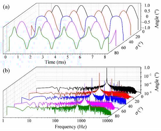 Next, the dependence of the demodulation results on σ was investigated. The carrier modulating frequency, sampling rate and the amplitude and vibration frequency of the simulated signals were assumed to be the same as above. As cm was kept to 2.63 rad, the demodulation results for angular vibration of 500 Hz were obtained and the simulated results are shown in Figure 4. Figure 4a shows the demodulated waveform in time domain, while Figure 4b shows that for the frequency domain. From these, we can see that there exist several high-order harmonic frequencies when σ does not equal to 0 or 60°. Finally, the variations of the amplitude, THD and SINAD with different σ were calculated, as shown in Table 2. From Table 2, it can be seen that the amplitude values are kept steady, while the THD and SINAD change considerably with different σ. It should be noted that the v in Equation (10) equals to 1 when σ is chosen as 0 or 60° and the demodulation results have a THD of less than 2% and a SINAD of more than 50 dB.