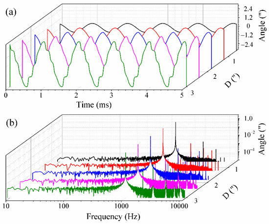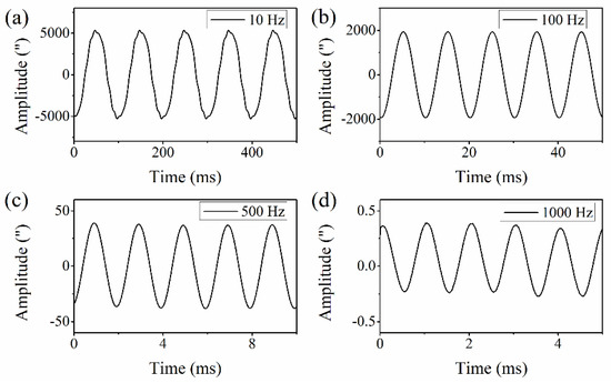 Next, a high-frequency angular vibration exciter system was established to evaluate the dynamic performance of the SPMAI. Referring to [19], the angular vibration exciter system used comprised a signal generator (XF1965, NF), a power amplifier (ATA-3040, Aigtek) and an angular vibration table. The signal generator produced a sinusoidal electrical signal, the amplitude and frequency of which could be adjusted. This electrical signal was amplified by a power amplifier and transmitted into an angular vibration table. The signal generator used could provide a tunable frequency ranging from 0.01 μHz to 15 MHz, with a frequency accuracy of 0.01 μHz. The power amplifier used could work well within a frequency range of DC–30 kHz with a slew rate of 10 V/μs and its maximal output power reached 360 W. In addition, the used angular vibration table was specially designed and fabricated by our lab and was driven by a brushless DC motor. The SMR was fixed on the top of the angular vibration table. As the electrical signals from the signal generator drove the angular vibration table, the SMR was rotated a certain angle and thus the interference signals of the SPMAI showed a corresponding change. According its specifications, the high-frequency angular vibration exciter system used could provide an angular vibration within the frequency range of 1–1000 Hz. In the experiments, the real-time rotation angle values were measured as the angular vibration frequencies were increased from 1 Hz to 1000 Hz with an arbitrary increment. It should be noted that the amplitude of the angular vibration table used was adjustable. Figure 9 presents the results measured with the angular vibration frequencies of 10 Hz, 100 Hz, 500 Hz and 1000 Hz. From these results, one can infer that the measured amplitude was decreased from 5444.60″ at a frequency of 10 Hz to 0.31″ at a frequency of 1000 Hz, which was mainly limited by the angular acceleration of the angular vibration table. The measured results in Figure 9a–d show that there exists a steady amplitude in several angular vibration cycles. Furthermore, the amplitude values measured at several typical angular vibration frequencies are presented in Table 4. From the experimental results above, one can find that our proposed SPMAI can realize angular vibration measurement with an amplitude of sub-arcsecond within the frequency range of 1–1000 Hz.