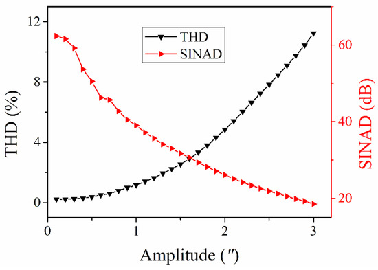 From these two equations, the measured signals are expanded into a series of high-order harmonic frequencies, the amplitude values of which are dependent on the order of the Bessel function. It is well known that the value the Bessel function is decreased greatly with the order. In practical engineering applications, the harmonic frequency can be neglected if its amplitude is less than ten percent of the total amplitudes of the lower-order harmonic frequencies. For the PGC-Arctan demodulation algorithm used, the harmonic frequencies at orders of more than 3 were neglected; thus, the sampling frequency should meet Fs > 5fc. On the other hand, the dynamic range of the PGC-Arctan demodulation algorithm can also be determined as D < fc/2fs. It should be noted that the performance of the used low-pass filters was assumed to be ideal; thus, their transition frequency band was not considered. Here, fs, fc and Fs were respectively assumed to 1 kHz, 10 kHz and 100 kHz, while the amplitude values of the angular vibration were increased from 0.6″ to 3″ with an increment of 0.6″. The simulated demodulation results of the PGC-Arctan algorithm used are presented in Figure 5. Figure 5a shows the demodulation results in the time domain as the amplitude of the measured signals was increased from 0.6″ to 3″. From Figure 5a, one can see that the waveform distortion becomes obvious with the increase in D. Figure 5b shows the corresponding demodulation results in the frequency domain. The variations of the amplitude, THD and SINAD with different D were calculated, as shown in Table 3. From Table 3, one can see that the demodulated amplitude changed slightly at these chosen D values within 0.6″–3″. However, with the increase in D, the THD increased considerably and the SINAD decreases greatly, which demonstrates the demodulation capability is limited by D at a certain frequency. Furthermore, the dependence of the THD and the SINAD on D is presented in Figure 6. From Figure 6, one can see that the THD increased gradually as D was increased from 0 to 3″. On the other hand, there exists an inversely proportional relationship between the SINAD and D, which is consistent with the above theoretical analysis. In general, a SINAD of 30 dB can meet our angular vibration measurement, thus a dynamic range of more than 1.6″ can be provided at the frequency of 1 kHz.