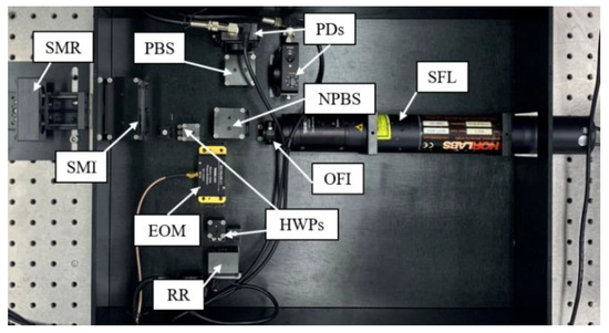 In the experiments, an SPMAI prototype was constructed and developed into a measurement instrument, as shown in Figure 7. From Figure 7, one can see that the whole optical structure was installed within a metal box. The SFL (HRS015, Thorlabs), OFI (IO-2D-633-VLP, Thorlabs), EOM (EO-PM-NR-C1, Thorlabs), PDs (PDA36A2, Thorlabs) and other optical elements (PBSs, BSs, NPBSs and retro-reflectors) were used in the experiments. The typical wavelength of the SFL was 632.991 nm with a frequency stability of ±0.004 ppm and its polarization ratio was higher than 1000. The EOM used was a DC-couple broadband version, which could provide a phase-modulation frequency ranging from DC to 100 MHz. Based on its specification, Vπ was 135 V at a wavelength of 633 nm for this EOM. The OFI was based on the Faraday effect, which can rotate the polarization direction of the input beam 45°. Two PDs were used to receive the measurement interference signals and convert the light signals into voltage signals. It is noted that the PDs used were amplifiable, switchable-gain, Silicon detectors and the gain of 20 dB was chosen to provide a bandwidth of 1 MHz. These PBSs, BSs, NPBSs and retro-reflectors were fixed by designed mechanical structures. The RR and SMR were composed of retro-reflectors with the same model (PS975-A, Thorlabs), the length of which was 22.0 mm and the diameter was 25.4 mm. Moreover, these retro-reflectors had a surface flatness of λ/10 at 633 nm and a clear aperture of 17.8 mm. For the SMR used, d was 31.21 mm. Meanwhile, these electrical and optical devices were fixed by several designed mechanical structures. In addition, a DAQ (USB-6212, NI) and a high voltage amplifier (HVA 200, Thorlabs) were adopted. The DAQ used had 16 analog input channels (AIs, 16-bit, 400 kS/s) and 2 analog output channels (AOs, 250 kS/s). The DAQ not only could collect the analog voltage signals from PDs, but could also output the analog voltage signals to modulate the EOM. In order to ensure that the EOM could provide enough modulation depth, the HVA was used to amplify the modulated voltage signals from the DAQ. Here, by means of the LabVIEW program for PC, the modulation frequency of sinusoidal voltage signals could be adjusted.