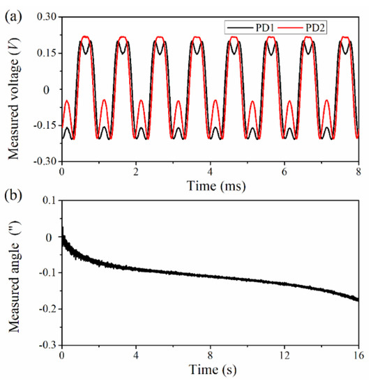Firstly, the static performance of the SPMAI was evaluated. Both the SMR and the SPMAI were placed on an optical platform and there was no applied noise suppression measure. Two PDs were connected to the AIs of the DAQ in a non-reference single ended (NRSE) manner, while one AO of the DAQ was connected to the HVA and the amplified signals was transmitted to the EOM. As the carrier frequency and sampling rate were respectively set to 10 kHz and 100 kHz, the interference signals were sampled by the DAQ and then transmitted to the PC. The amplitude of the carrier signals was adjusted to 5.58 V and the measured results are shown in Figure 8. Figure 8a presents the interference signals measured when the SMR was still, where the black line denotes the interference signals detected by the PD1 and the red line denoted the interference signals detected by the PD2. Using the PGC-Arctan algorithm on LabVIEW, the rotation angle of the SMR could be obtained. Figure 8b presents the angle variations over the measurement time range of 0–16 s. From Figure 8b, one can see that the angle values measured decreased from 0.027″ to −0.178″. Furthermore, the SPMAI had an average output angle value of −0.109″ with a standard deviation of 0.033″. These experimental results demonstrated that our proposed SPMAI had a good static performance.