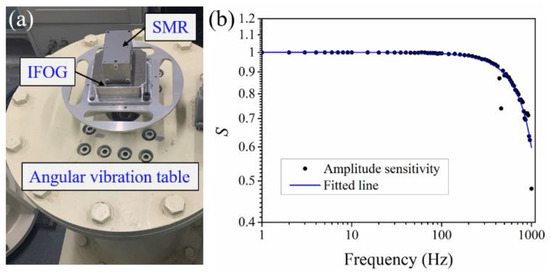 (a) Experimental setup for measuring bandwidth of the IFOG using the SPMAI; (b) Relationship between the amplitude sensitivity and the angular vibration frequency.