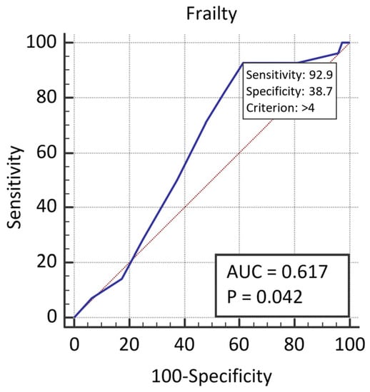 Figure 1 presents the ROC curve for the prediction of an electric shock of an ICD by frailty. The area under the curve was 0.617(95% CI = 0.516–0.711), the cut-off value for a designation of frailty was >4 (p = 0.0420).