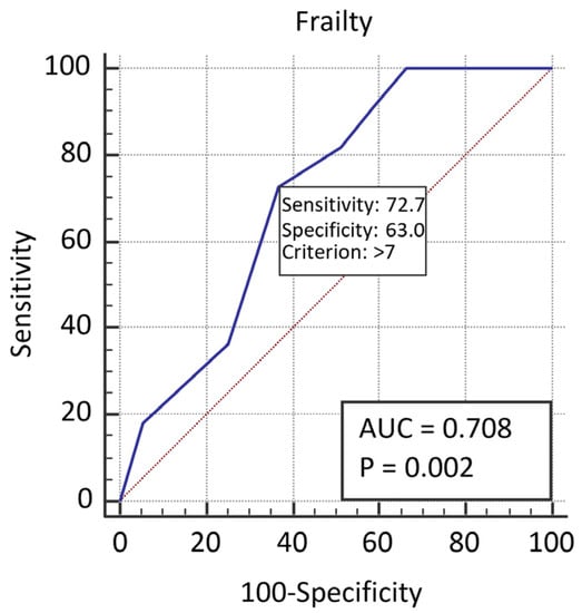 In the ROC curve, which is graphically presented in Figure 2, for the prediction of occurrence, inappropriate shocks by frailty, the area under the curve was 0.708(95% CI = 0.610–0.793). The cut-off value for the recognition of frailty was > 7 (p = 0.0021).