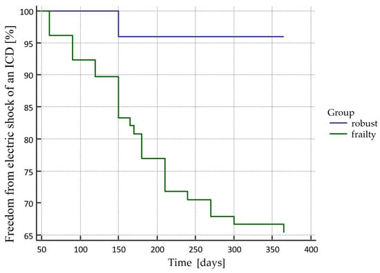 Studies have shown that the need to consider a frailty assessment when making decisions about treatment is critical. Treating elderly patients is often associated with a high risk of complications. The incorporation of a frailty analysis into the risk stratification can help to differentiate older patients who could benefit from an intervention from those for whom aggressive intervention might cause a deterioration in their health [,]. Patients with ventricular arrhythmias that have been treated with an implantable ICD constitute a specific subgroup of patients. Conducting research to assess the prevalence of the frailty syndrome in this particular patient population is an important factor that may affect the fate of a patient.