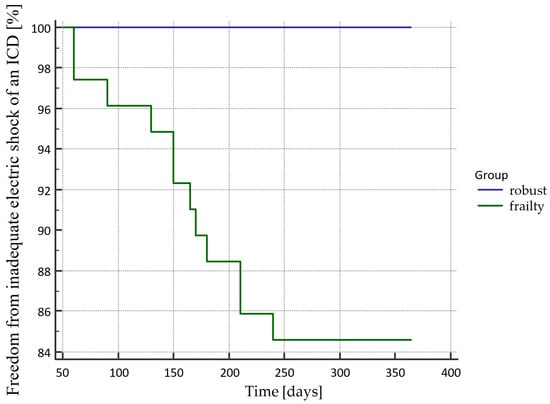 Freedom from an electric shock of an ICD according to the presence of frailty is presented in Figure 3; the difference was statistically significant (p = 0.0044). An analogous situation occurred in the case of inadequate electric shocks, and the differences were statistically significant (p = 0.0414). The curve is presented in Figure 4. The analysis of the electric storm episodes showed that these events occurred in patients with recognized frailty syndrome but did not occur in patients without frailty syndrome.