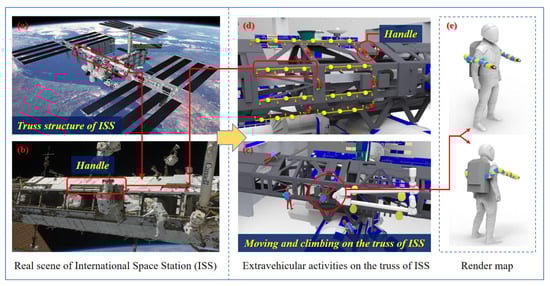 At present, human manned space activities mainly rely on the space station, which is equivalent to a space laboratory with modern scientific research equipments and is capable of conducting scientific experiments in microgravity environment. It also provides a platform for astronauts to stay in earth orbit for a long time in space, and makes it convenient for astronauts to carry out space experiments, extravehicular walking and other on-orbit activities. In the meanwhile, astronauts need to carry out the extravehicular assembly, inspection and maintenance of the space station. Figure 1 shows the real and simulated scenes of the ISS, and the simulation scene of astronauts’ extravehicular activities assisted by wearable robotic limbs. The structural design of the ISS is based on the truss structure, which constitutes the keel frame of the space station, as shown in Figure 1a,b. Other multi-function modules, extravehicular service equipment, large mechanical manipulator service systems and solar panels are all installed on the keel frame, which forms a truss hanging cabin type space station. On one hand, it ensures the overall stiffness of the space station, and is conducive to the normal independent operation of each subsystem. On the other hand, it can provide a foothold for astronauts’ assembly and maintenance activities. As shown in Figure 1c,d, astronauts rely on the truss of the space station to move, climb and work outside the cabin. The red frame marks represents the handles installed on the truss for facilitating climbing and moving.