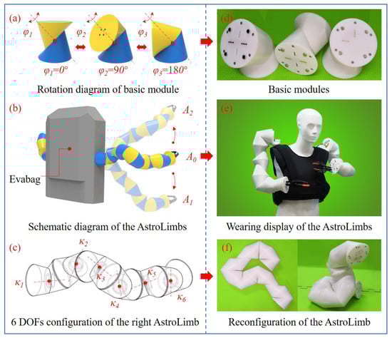 Wearable robotic limbs for astronaut extravehicular activities assistance. (a) Rotation diagram of basic module. (b) Schematic diagram of the AstroLimbs. (c) 6 DOFs configuration of the right AstroLimb. (d) Basic modules. (e) Wearing display of the AstroLimbs. (f) Reconfiguration of the AstroLimb.