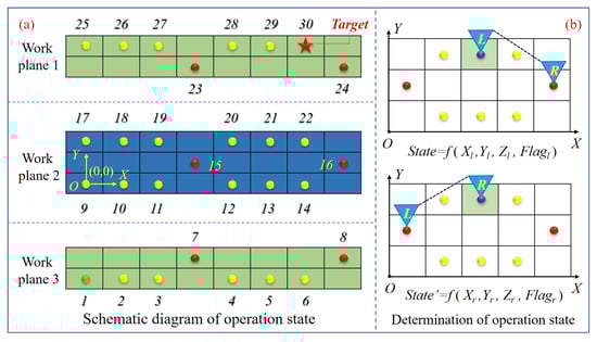 According to Table 1, {x, y, z} is the equivalent coordinate (Eq-Coordinate) of the right end relative to the left end, as shown in Figure 3b. x represents the interval number of the state points of the right end relative to the left end in the X-axis direction, and the value of x can be obtained (x∈{1, 2}). In the same way, y represents the interval number of the state points in the Y-axis direction and then y∈{0, 1, −1} can be obtained, where the sign represents the front and back position relationship between the two ends. Especially, the minus sign represents that the left end is in front of the right side in terms of the Y-axis. For example, the equivalent coordinates of the two actions are {2, −1, 0} and {2, 1, 0}, respectively, in Figure 3b.