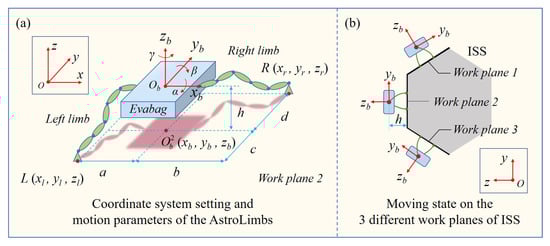Simulation environment setup based in the Vrep. (a) Coordinate system setting and motion parameters of the AstroLimbs. (b) Moving state on the three different work planes of ISS.