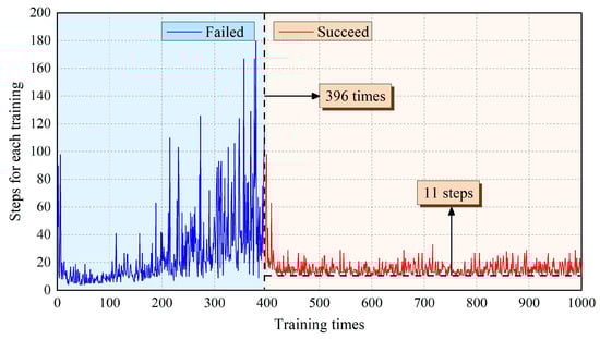 Figure 6 shows the steps that AstroLimbs needed to reach the final target. The horizontal ordinate stands for the training times and the vertical ordinate represents the step number required to reach the target point for each training episode. Once the robot moves out of bounds, it will be regarded as the failure of this training task and the robot will be reset to the starting point. In this situation, there is no definite number of steps to finish the moving task. That is to say, there are two possible results for the training. One is abnormal movement in which the AstroLimbs might go out of the boundary and fail to reach the target. The other is reaching the goal successfully. As shown in Figure 8, the blue area on the left represents training failure, and the red area on the right represents training success. During the first 1–395 training episodes, the AstroLimbs failed to get to the target. After 395 failures, the robot can reach the target point successfully on the 396th training and performed well after that.