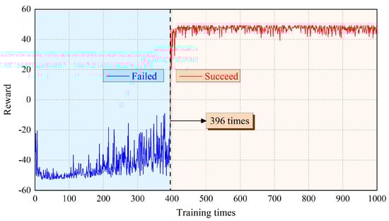 Figure 7 shows the cumulative reward value obtained by each training episode for the robot. Corresponding to Figure 6, taking the 396th training as the boundary, it can also be divided into the blue area of failure and the red area of success. It can be seen from Figure 7 that for the first 430 training episodes, the cumulative reward obtained by the robot gradually increases from −50 to 50 ignoring small fluctuations, where the reward is consistent with the setting value. After 430 times of training, the cumulative reward fluctuates slightly, but still tends to be stable. The robot gradually understands the environmental information and acquires the ability to choose the appropriate action.