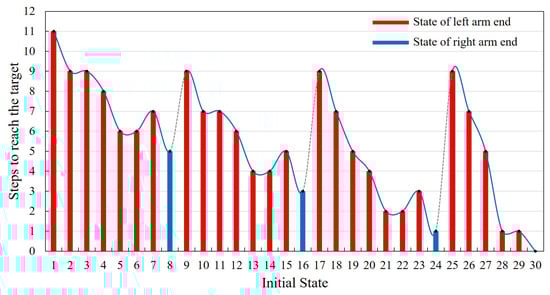In addition, based on the training results, the autonomous movement ability should be evaluated as well. State30 is the final target point, and the initial positions are set to be from State1 to State30, successively. During this evaluation process, whether the robot can reach the final target point successfully will be recorded. If it can reach the target point, the steps of the robot’s autonomous movement will also be preserved, which can be introduced as the evaluation criterion of the learning result. The results are shown in Figure 8. In the process of autonomous moving ability evaluation, the initial position state of the robot is set as the position of the left arm end. It is similar for the right arm end. Thus, only the former condition will be taken as a representative for further analysis. Besides, only one limited section of the ISS truss structure is intercepted as the training environment, which can be sufficient to verify the proposed learning method. The positions of State8, State16 and State24 are the right boundary of the training environment. When the end of the robot is within the three positions, the robot will move out of the training boundary after taking the next action. Therefore, to carry out the evaluation normally as well, we set the position of the right arm end as its state. The movement results of these three special positions are marked by blue columns in the Figure 8. In addition, when in State30, the robot does not need to perform any action to achieve the goal, the number of steps is recorded to be zero.