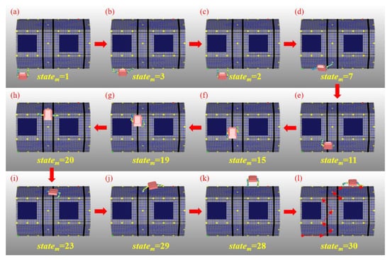 Sequential diagram of the autonomous movement simulation. (a) The state of the robot when standing at the initial point. (b) State after the 1st step. (c) State after the 2nd step. (d) State after the 3rd step. (e) State after the 4th step. (f) State after the 5th step.(g) State after the 6th step. (h) State after the 7th step. (i) State after the 8th step. (j) State after the 9th step. (k) State after the 10th step. (l) State after the 11th step to reach the final target.