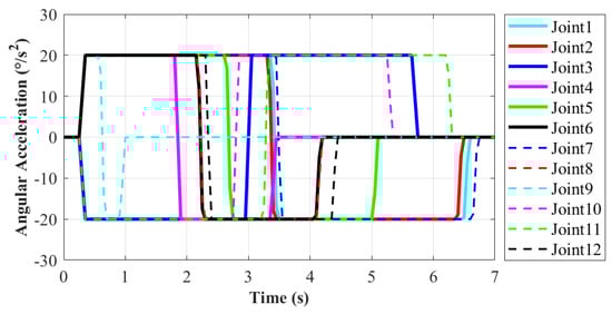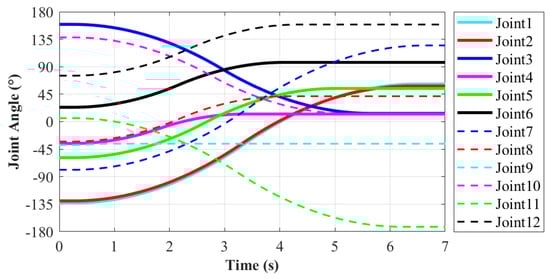 According to the motion planning, in order to make the motion relatively stable, the maximum angular velocity and acceleration of each joint are limited. The maximum angular velocity is limited to 90/s, and the maximum angular acceleration is limited to 20/s. In the meanwhile, when in the starting or ending point, the angular velocity and acceleration of each joint are set to be zero. Thus, the robot joints will not produce excessive impact. According to the Figure 10, Figure 11 and Figure 12, the solid lines stand for Joint1–Joint6, which corresponds to the left limb. Similarly, the dashed lines represent Joint 7–Joint 12 of the right limb. The total moving time for this process is 6.5 s. The rotation range of each joint is −180–180 based on the basic module. As shown in Figure 10, the minimum rotation angle is 2.1 that occurs in Joint9. The maximum rotation angle is 203.6 that belongs to Joint 7. It does not exceed the setting rotation range of the each joint, which can meet the requirements.