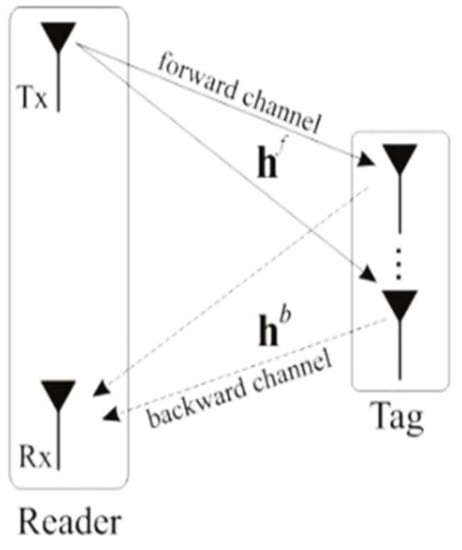 In RFID systems, both one-way and two-way channels are used to communicate, as shown in Figure 1. These are the so-called forward and backward channels. The notation is used to represent an RFID system with one reader transmitting antenna, tag antennas, and one reader receiving antenna. In [16], the system was alternatively called multiple input multiple output (MIMO).