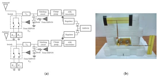 A dual antenna UHF MIMO RFID tag operating at 925 MHz built in our laboratory was used for the experiments. Figure 2a shows the UHF RFID MIMO tag circuit architecture and a photograph of it is shown in Figure 2b which is designed with reference to WISP tag [7]. The part of the front-end antenna is composed of Antenna 1 and Antenna 2 with their polarizations orthogonal to each other. As previously mentioned in this study, this design allows the tag to exhibit uncorrelated channel characteristics when transmitting or receiving signals, achieving the effect of polarization diversity. In the forward link, there are two sets of symmetric modules transmitting signals to the backend processor MSP430. This processor uses selective combining techniques to select the SNR. In order to achieve the passive effect of the tag, the ADG918 component [19] was used in the front-end RF switcher.