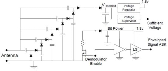 The ten (10) diodes in the voltage doubling ladder are the RF Schottky diodes. Instead of using a second mini harvester for demodulation, the demodulator is directly connected to the main harvester; however, it can be disabled to prevent energy leaking from the demodulation’s pull-down resistor. In Figure 3, LS is the lever shifter.