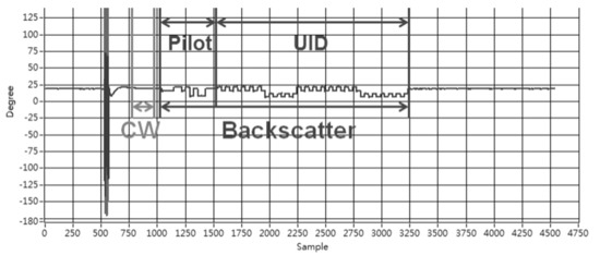 The tag’s backscatter signal is built as a response from the two tag antennas. As can be seen in Figure 4, there are the pilot and tag UID signals. The purpose of this backscatter signal is to let the reader synchronize the signal and estimate the channel state information (CSI). A more detailed explanation can be found in our previous study. The received signal strength indicator (RSSI) is cancelled out and the unique identification (UID) code is given by the six levels. In this case, the UID code was set to [011010].