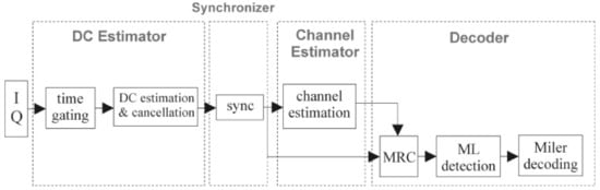 The baseband signal processing architecture is shown in Figure 5. It is mainly divided into four blocks: the DC carrier estimation, synchronizer, channel estimator, and decoder.