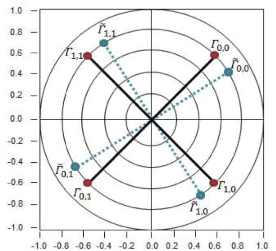 The corresponding channel estimation result and the maximum ratio combining technique are used to obtain the demodulation signal. The purpose of channel estimation is to obtain channel information that could cause signal attenuation in a wireless communication environment, mostly unknown phase changes and amplitude variations. We assume that it is a non-time-varying channel environment and we use the least square method (LS) for estimation [18]. Since our tag is manually soldered it is susceptible to phase and gain errors. This effect is shown in Figure 6, where indicates the i-th ideal reflection coefficient of the L-th tag antenna, and indicates the i-th measured impedance reflection coefficient of the L-th tag antenna. To reduce errors, measurements are taken beforehand, and then compensated during the estimation.