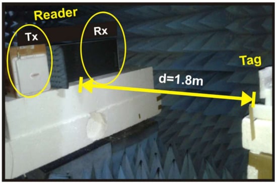 The experiments were taken at the Anechoic Chamber of National University of Science and Technology (NTUST), whereas good approximation to the Gaussian channels could be reached. The reader transmitting and receiving antennas, Tx and Rx, respectively in Figure 8, are both unidirectional patch antennas with a gain of 6 dBi. The antennas use circular polarization.