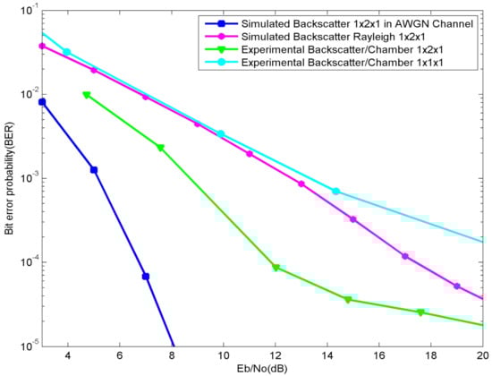To obtain the simulation results, we set the reader with a carrier frequency of fc = 925 MHz, the number of backscatter bits as 1,000,000 in total at each SNR level. The number of Monte Carlo simulations is N = 50,000. To perform this experiment, in the first place, the reader is allowed to repeatedly transmit query instructions 50,000 times, so that the tag continuously returns the backscattered signal and decodes it. The decoding part is divided into maximum likelihood detection decoding and Miller decoding. The error accumulation is the sum of the symbol errors, latter the sum of bit errors, which are then used to calculate the SER and BER, respectively. To obtain different values of SNR, we added FAT-AM5AF5G6G2W3 attenuators at the receiver side (connecting to the VST), with a gap of 3 dB in each experiment trial. We used a 50 Ω terminator to obtain the thermal noise for the SNR reference value. For the channel variance, we used 0 dB. Each antenna of the tag uses the BPSK modulation as in the mathematical description. The key parameter Kf and Kb are illustrated later.