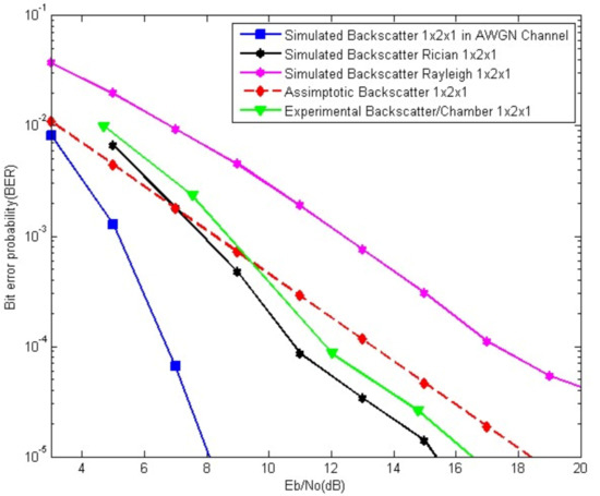 where Q(·) is the Q function, Eb is the bit energy, and g is the constant gain that depends on the modulation scheme. For the QPSK modulation, g = 2 and we express γ = Eb/N0. The BER of our backscatter system, averaged over the channel is given by: