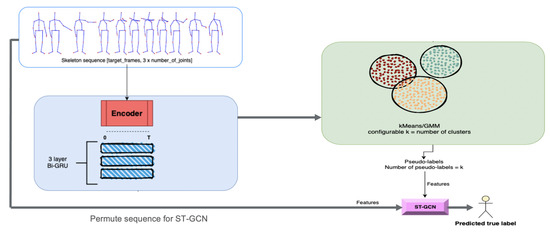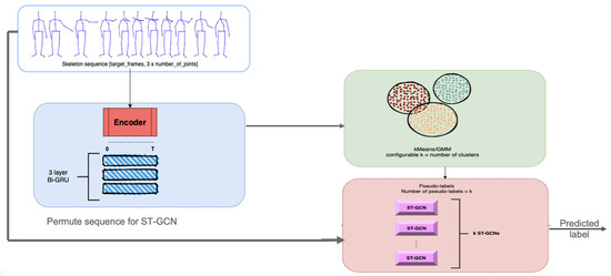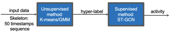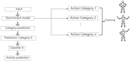 Starting from this idea, a model that can discriminate between activities by grouping them together based on their similarity measures was created. The first part performs clustering that can be seen as a ‘discriminative model’. After the datum is fed into this model and a “hyper-label” is assigned to each activity, the input will be analyzed by a small ST-GCN model, which can classify only activities belonging to its subset. Rather than having a single model to generalize all the activities from the dataset, the dataset is split into multiple categories in order to reflect the similarities between them. Figure 2 depicts the architecture of the proposed method.
