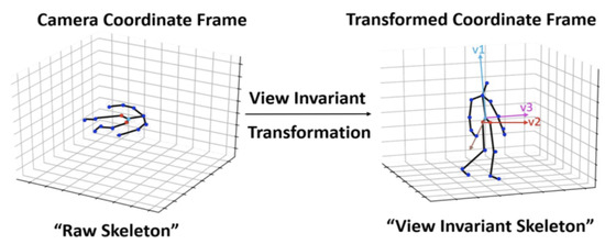 In order to render the recognition more robust, a preprocessing step was performed as in [16]. The action sequences were aligned using a view-invariant transformation. This transformation projected the body keypoints from the original coordinate system to a view-invariant coordinate system.