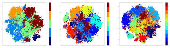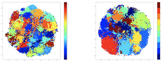 Based on the results that are shown in Table 7, the retraining of the ‘clustering’ step hurts the performance of the approach on the NTU-RGB+D 120 dataset. The problem comes from the specific encoding of the activities, and it can be observed by plotting the t-SNE features of the hidden space of the encoder. The visualization is available in Figure 10. Unlike the original encoding of the NTU-RGB+D dataset, the new encoding shows undefined clusters, with plenty of overlaps between the samples. In this case, not even the ‘majority’ mechanism can alleviate the problem, because this breaks the distribution of classes across the clusters. Some of the clusters will have fewer classes than the others, resulting in the degradation of the training process.