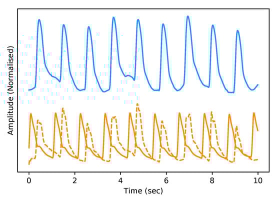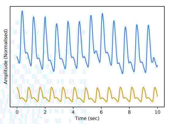 The test dataset “University of Queensland vital signs dataset: development of an accessible repository of anaesthesia patient monitoring data for research” [] provides a multitude of vital sign waveform data recorded from patients undergoing anaesthesia at the Royal Adelaide Hospital. The physical state of patients under anaesthesia contains marked changes to cardiovascular variables compared to ICU patients, presenting a further challenge to our framework. We are only concerned with the ABP and PPG measurements from this dataset; these are sampled at 100 Hz. We selected only one patient, namely Case 5, and segmented the data into 10-s intervals, which yields a [900, 2, 1000] dimensional vector (150 min) that constitutes the test dataset for our framework. We are only concerned with the PPG and ABP signals from these datasets; see Figure 2 for an example of the real data used in this work.