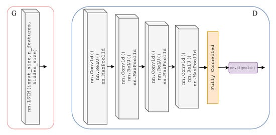 Architecture of Generators and (left) which are two-layer stacked LSTMs with 50 hidden units in each layer and a fully connected layer at the output, with an input size of 1000. Architecture of Discriminators and (right) which are 4-layer 1-dimensional CNNs (ReLU activation and max pooling functions) with a fully connected layer and sigmoid activation function at the output.