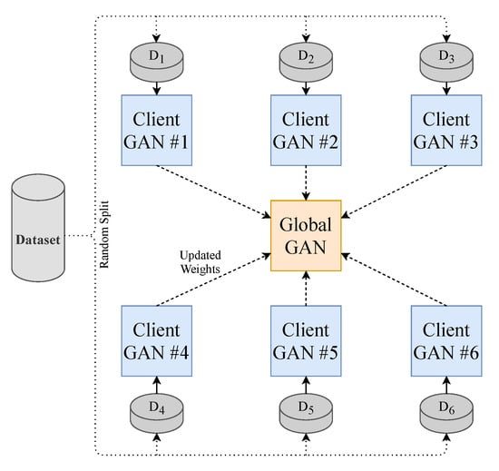 Federated Learning methodology employed in this paper. Each GAN is represented by the model shown previously in Figure 1.