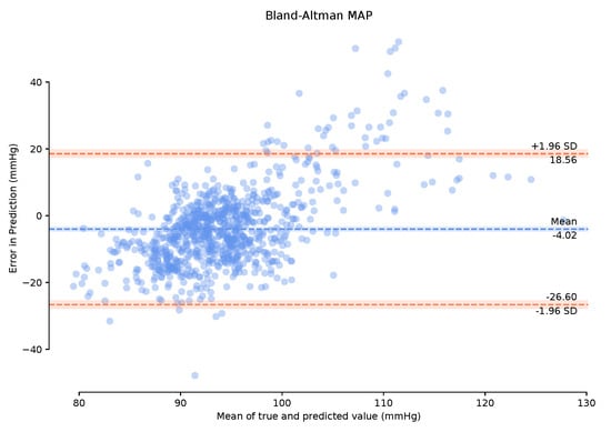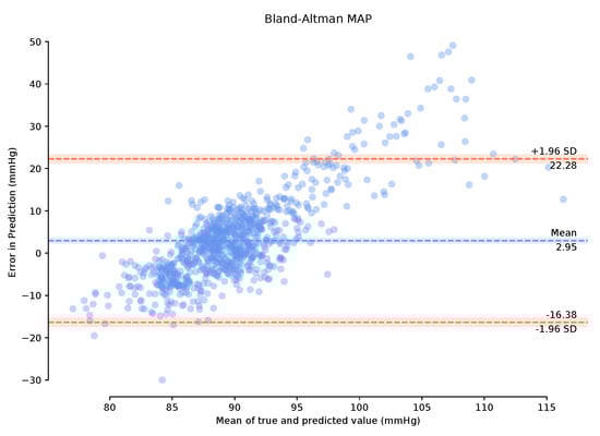 Observing the Bland–Altman plot in Figure 7 our framework achieved a mean MAP error of −4.02 mmHg and a standard deviation of 22.6 mmHg. We also present the Bland–Altman plots over the 149-min period with a 1-min calibration period that achieved a mean MAP error of 2.95 mmHg and a standard deviation of 19.33 mmHg. This calibration period can prove useful in bringing the mean error to within the AAMI standards. The BA plots show the 95% range from to . The MAP range of [25.16 mmHg, −20.08 mmHg] in Figure 8 demonstrates that the one-minute calibration period was successful in reducing the overall bias in the mean error.