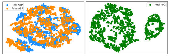 We have implemented an explainable AI (XAI) approach known as t-Distributed Stochastic Neighbor Embedding (t-SNE) [] in the interest of trustworthy AI. This is a well-known technique of dimensionality reduction that is suited well to the visualisation of high-dimensional datasets. We implement t-SNE on our real ABP and PPG test datasets, as well as the generated ABP data. Figure 9 (left) illustrates a clustering effect between the real and synthetically generated ABP that is distinctly different from the t-SNE embedding on the PPG data. This demonstrates that we can now effectively cycle the time series PPG data from its own modality (Figure 9 (right)) to a distribution that is much more representative of the ABP data.