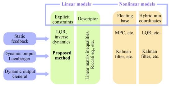 Figure 1 presents a diagram, sorting the aforementioned multitude of methods with respect to the plant model types they use (linear: with explicit constraints and in descriptor form, and nonlinear: in floating-base form and in hybrid dynamics form with minimal coordinates), and the type of feedback control they implement: full state feedback (static feedback) and dynamic output feedback (in Luenberger form and in general form).