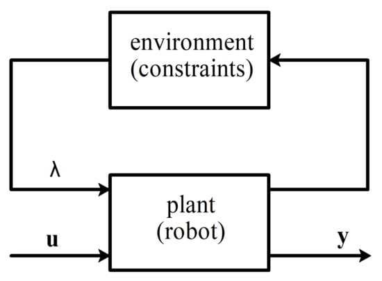 where , and are state, control input, and measured output, , , and are state, control, and observation matrices, respectively, and are constraint Jacobian and constraint matrix and are reaction forces (or Lagrange multipliers). From the given formulation, it follows that the rate of change for the state of the system lies in the subspace of . We can treat as input generated by the environment, acting on the plant, which would allow us to use linear-fractional transformation on it (see Figure 2). Expressing out leads to the following matrix representation:
