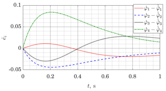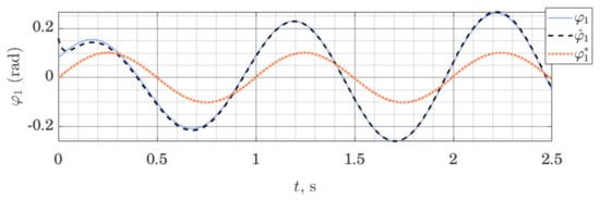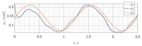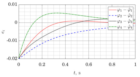 The simulation is set up as follows. The model of the robot is linearized along a nominal trajectory, and stabilizing affine control law is found for the resulting linear model at each time step by solving the Riccati equation. In the same way, observer gains are found at each time step. That represents a gain scheduling approach for control and observer design [47]. We log both the evolution of the state of the robot and the state of the observer; for conciseness, we only present the evolution of the observer error with respect to joint angles and their estimates .